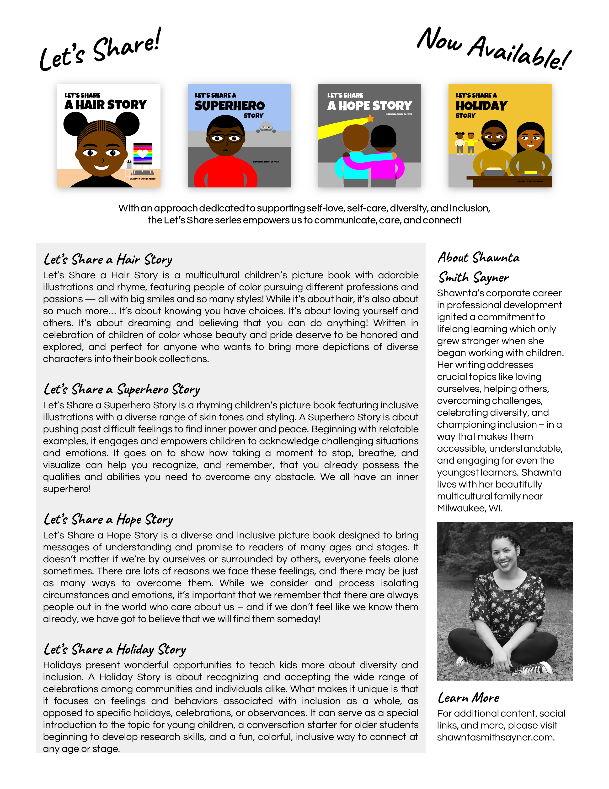 Shawnta Smith Sayner writes adorable children’s picture books featuring multicultural illustrations and heartfelt rhyme. With an approach dedicated to supporting self-love, self-care, diversity, and inclusion, her Let’s Share series empowers us to communicate, care, and connect! Discover and explore more at http://www.shawntasmithsayner.com. - Professional Background Bio (~65 Words)